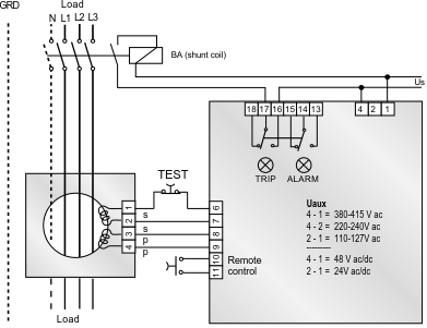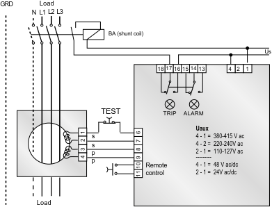 | Configurable tripping delay time (t) | 0,02...0,5s 0,2...5s. |